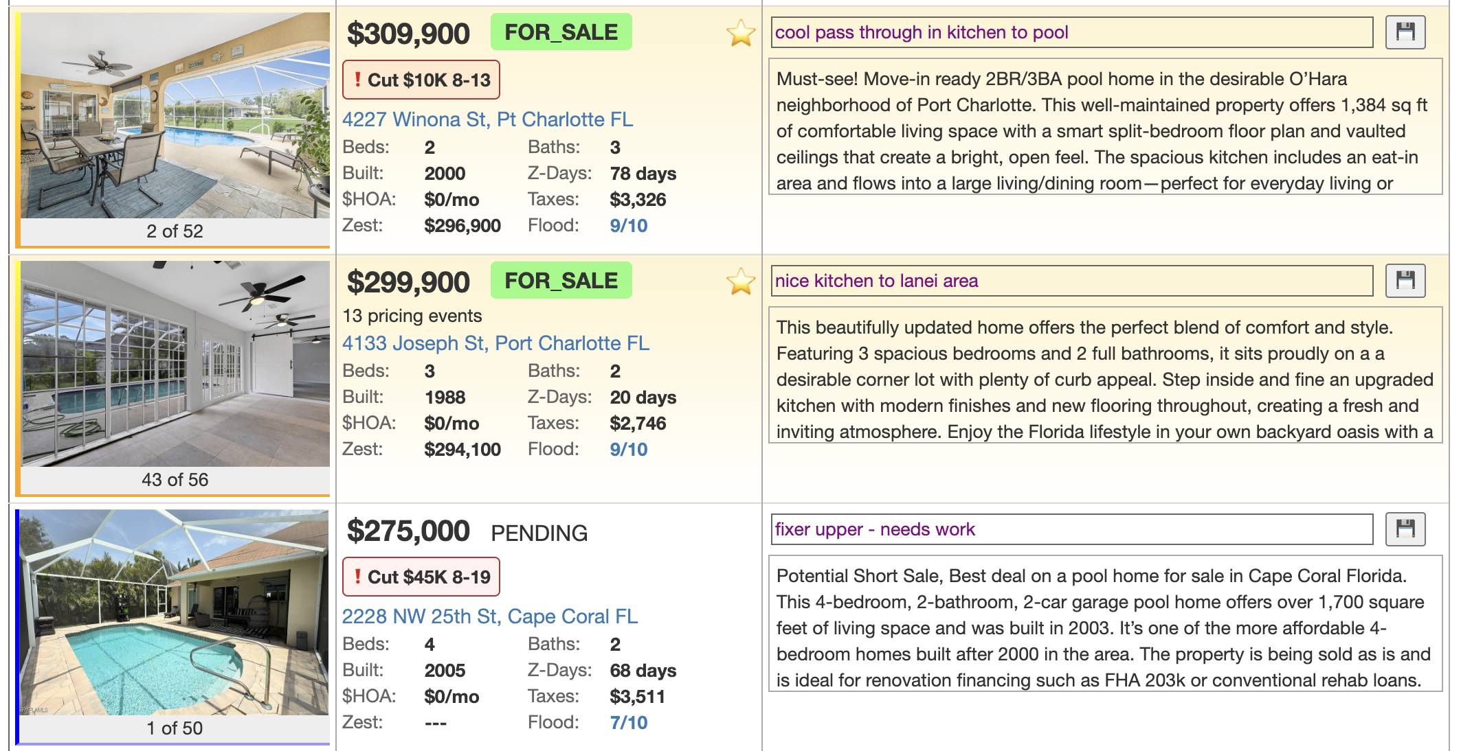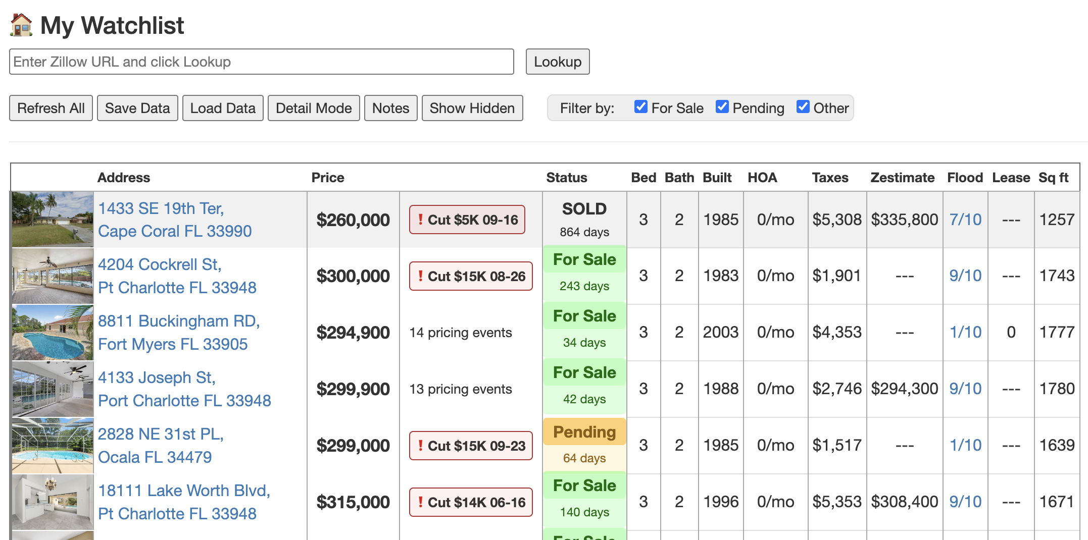 Zillow-Track gives you the ability to see each property in a detail mode, to show more information, or a summary mode, to track the key data points across homes. You can switch between detail and summary mode easily. We are working on more features to make it possible for you to customize the UI to show the information that is most important to you!